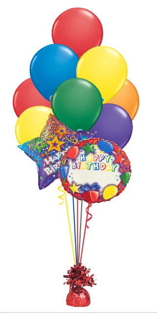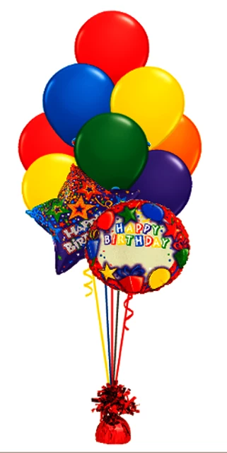 The default latex balloon colors in this bouquet comprise the full rainbow spectrum, as illustrated. However, if you prefer to use other colors, simply list those colors in the comments box on the shopping cart page, where you will find a link to the color chart. Be sure to list all of the colors you want included, and use the full name of those colors as posted on the color chart. There are 10 latex balloons that can be color-specified in this order. The 2 mylar balloons are designed with bright rainbow colors and cannot be changed.