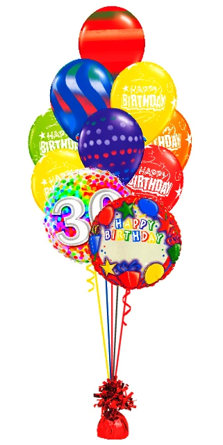 This great bouquet includes a variety of airbrushed patterns and Happy Birthday Loops & Stars, complimented with personalized balloons for birthday age and name.