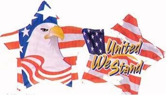 A beautiful double sided American Flag. With and Eagle on one side and the words “UNITED WE STAND” on the other side.