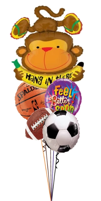A collection of assorted sports ball balloons capped with a jumbo Hang in There Monkey. Hospital approved.