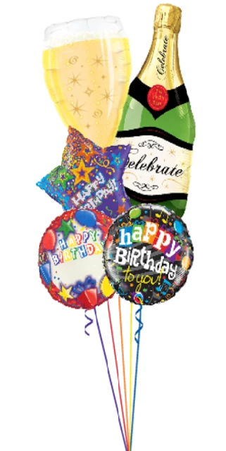 This cheerful bouquet is a great way to send someone a toast! This bouquet includes five premium mylar balloons, including a personalized Birthday Balloon.