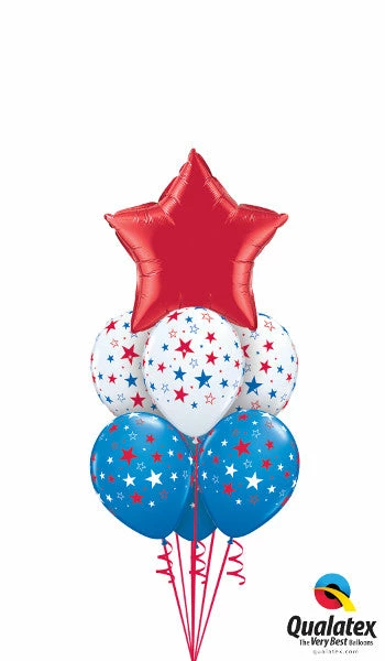 Show your patriotic spirit with this Red, White, and Blue bouquet featuring latex balloons and a MicrofoilÂź Star on top!