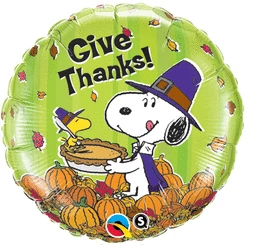 Snoopy in his Pilgrim dress is celebrating Thanksgiving. Add this cute give thanks balloon to your next Fall celebration.