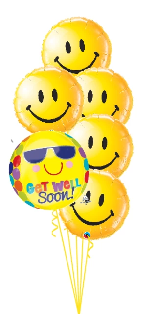 A bright collection of classic yellow smiley faces, featuring a Get Well Soon spherical Orbz balloon. Hospital approved.